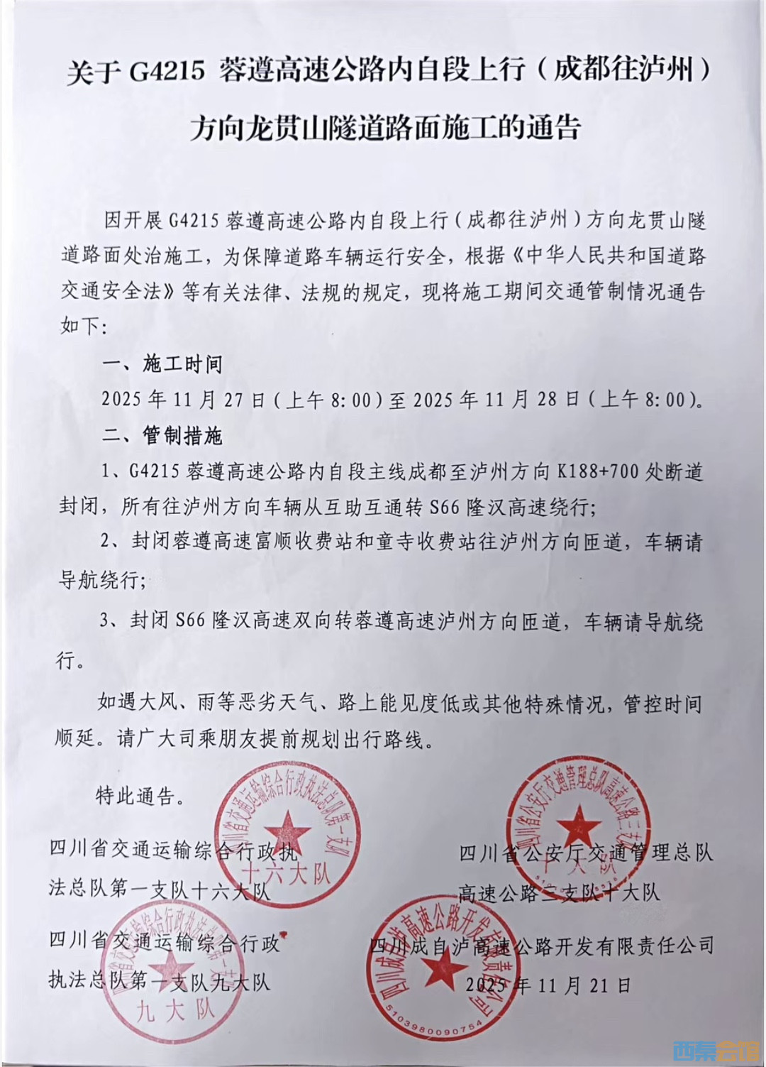 关于G4215 蓉遵高速公路内自段上行(成都往泸州)方向龙贯..