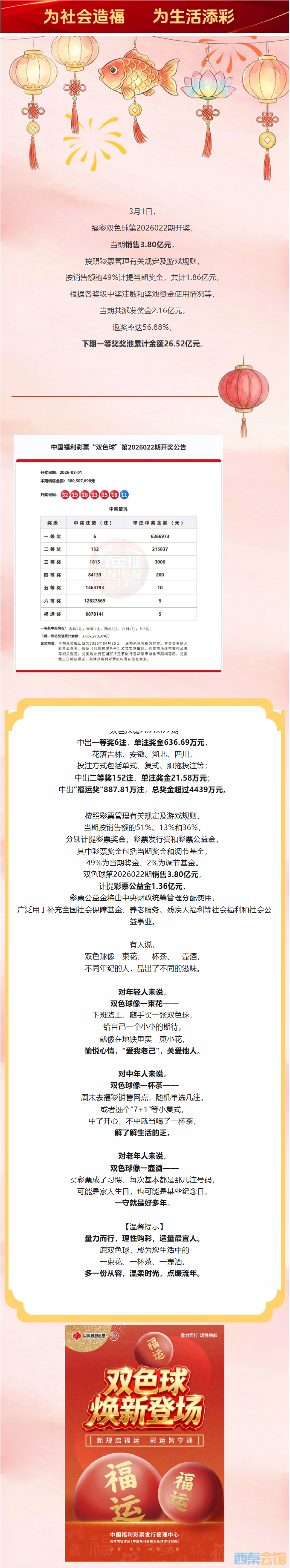 双色球第2026022期开奖中出一等奖6注,下期奖池26.5..
