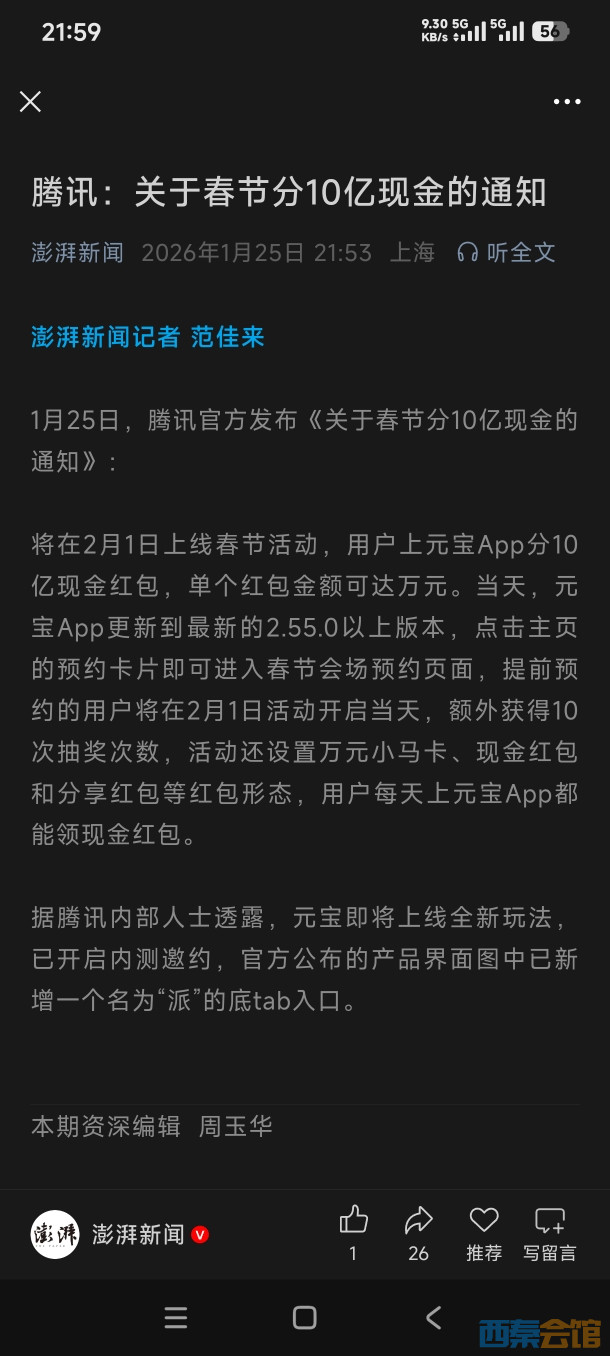 腾讯关于春节瓜分10亿元的通知。