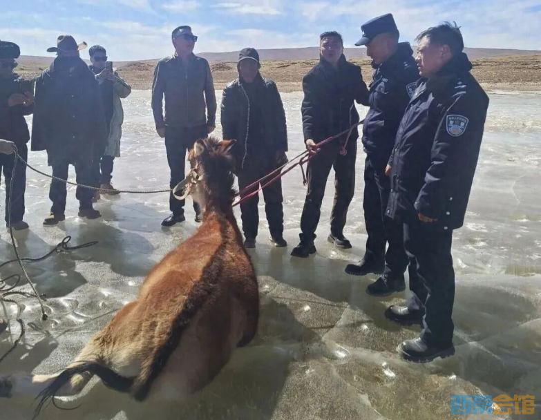 青海玉树公安救助一头藏野驴,腿部受伤被困冰面,为国家一级保护..
