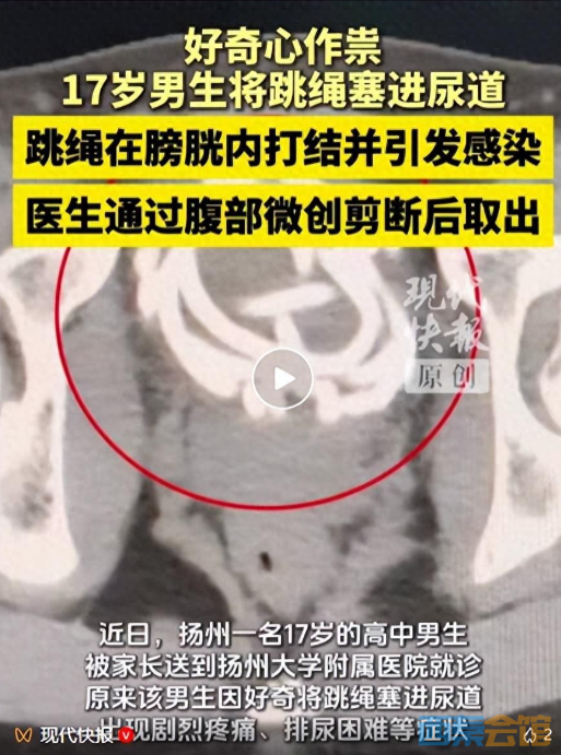 17岁男生将跳绳塞入尿道,检查结果显示:尿道黏膜因异物刺激布..