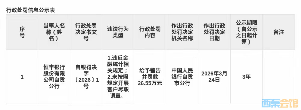 恒丰银行自贡分行被罚26.55万,涉金融统计违规等