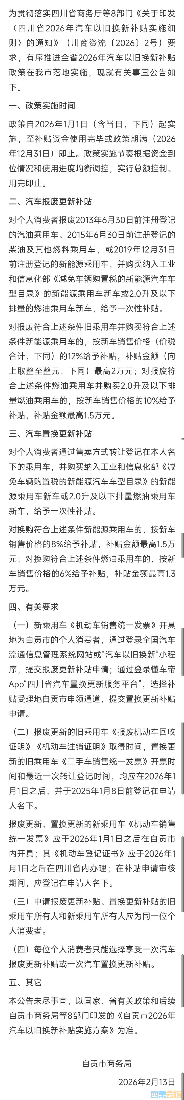自贡市商务局关于实施2026年汽车以旧换新补贴政策的公告