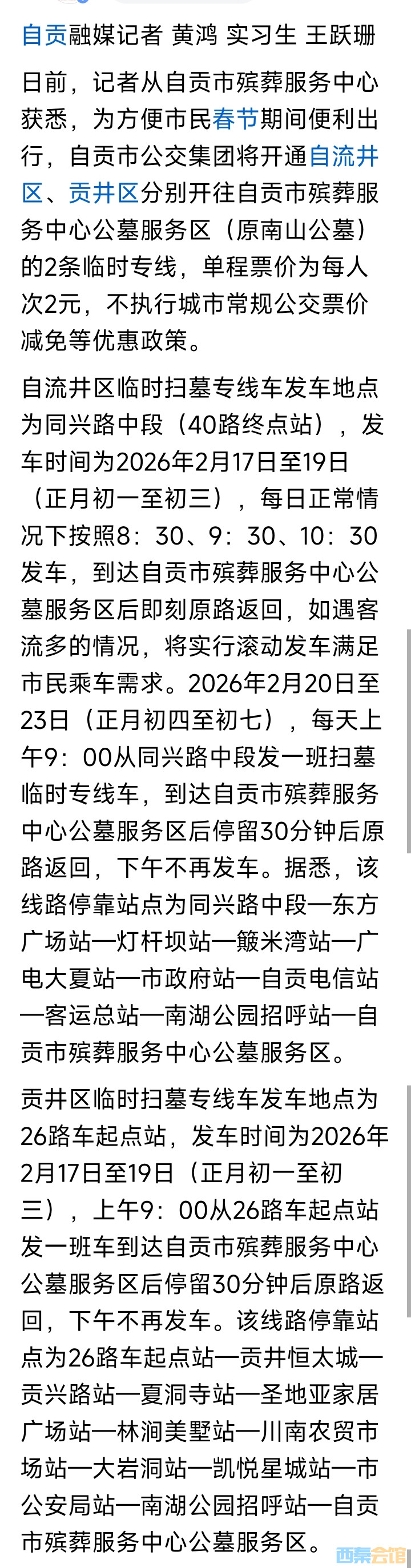 自贡将开通春节扫幕临时公交专线