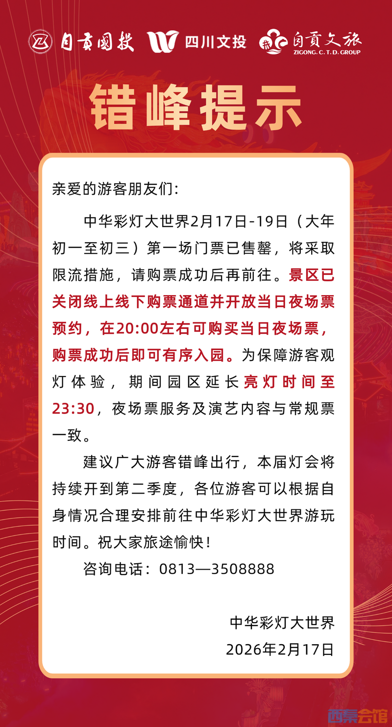 自贡·中华彩灯大世界错峰提示 初一至初三第一场门票已售罄…