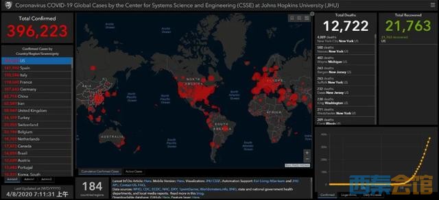 据美国约翰斯·霍普金斯大学发布的数据显示,截至北京时间4月8日7时11分,美国累计确诊396223例,累计死亡12722例。疫情最为严重的纽约州确诊138836例,已经超过意大利。