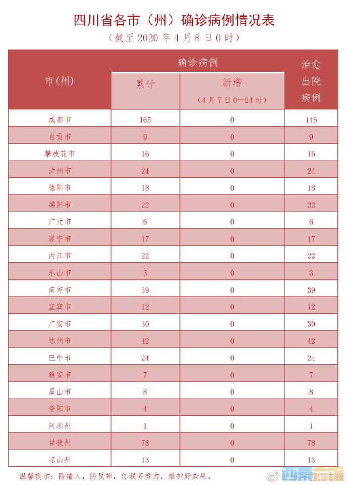 4月7日0-24时,全省无新增无症状感染者,当日转为确诊病例0例,当日解除集中隔离医学观察0例。尚在集中隔离医学观察15例(其中成都7例、泸州1例、绵阳2例、达州2例、广安1例、凉山2例)。