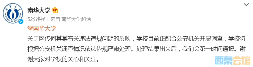 关于网传何某某有关违法违规问题的反映,学校目前正配合公安机关开展调查,学校将根据公安机关调查情况依法依规严肃处理。处理结果出来后,我们会第一时间通报。谢谢大家对学校的关心和关注。