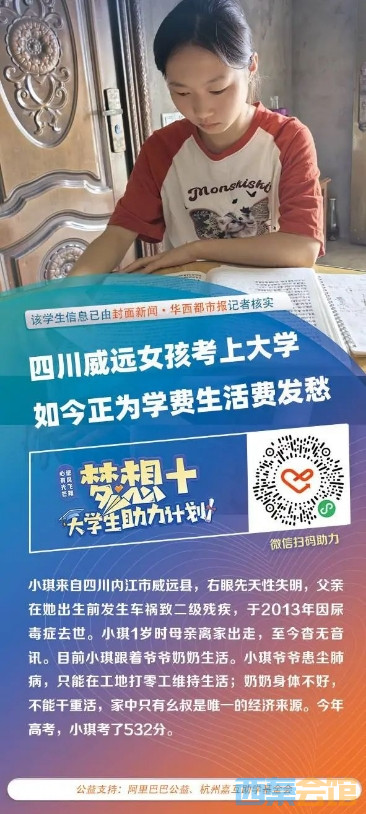 自幼品学兼优省钱买学习用品 多做笔记加深记忆母亲出走,父亲去世,熊嘉琪成为一名事实孤儿。因为深知只有读书才能改变命运,所以她自幼便懂事上进,从小学到中学,成绩一直名列前茅。小学时,熊嘉琪在村小念书,放学回家除了做作业,还会帮爷爷奶奶做农活、煮饭。中学时,她到了县城读书,尽管学校对住宿费、学费给予了减免,但生活费仍然捉襟见肘。“有时回来拿生活费,我们就想方设法地凑,比如卖点鸡鸭。”阚友英说道。熊嘉琪也不攀比,她的衣服大部分都是亲戚穿过的。“只要能吃饱,穿暖就行。”熊嘉琪坦然地说,有时需要买学习用品,她也不好意思找家里要,而是选择那一周吃差一点或者少吃点。因为缺乏营养,她时常感冒。高中考上威远中学后,熊嘉琪更加刻苦勤奋,有时轮换座位,坐在后排看不清电子白板时,她就把凳子搬到前排去听。凡是老师讲过的重点,她都记下来,多看几遍加深记忆,她的笔记总比同学们多一些。读书期间,她几乎没有自费买过课外教材,除了有老师赠送的因素,更多的是将学校发的教辅资料学深悟透。高三模拟考试,她一直名列班级前三名。性格开朗外向热心帮助同学 打暑假工挣大学学费在高中班主任教师欧涛看来,熊嘉琪最难能可贵的是乐观开朗的心态。三年来一直担任班干部和学校自治会干部,不仅协助老师和学校开展相关工作,还热心帮助同学。熊嘉琪说,高考期间有些紧张,数学考试没发挥好,532分并不是她的理想成绩。尽管如此,她也接受现实,高考志愿填报的是川内一所二本院校。和其他同学不一样,她并不向往大城市,只想离家近一点,方便照顾爷爷奶奶。不久前,熊嘉琪在威远县城找了一份暑假工,在保险公司做电话销售,锻炼口才的同时也赚点大学学费。看着熊嘉琪主动为家庭分担,小叔熊杰十分欣慰。11年前哥哥临终托孤,他含泪答应无论如何也要将侄女养育成人。为了完成这一承诺,他在工地上加班加点,找另一半也要求必须接受侄女,虽然至今未婚,但是他并不后悔。这两年随着工作机会的减少,熊杰的收入也在减少。采访时,因为上一个工程结束,下一个工程还没着落,他在家休息,正焦虑熊嘉琪即将面临的大学费用。新闻延伸:6月29日,封面新闻、华西都市报联合阿里巴巴公益发起的“梦想+”大学生助力计划(原名:励志学子追梦计划)正式启动,项目旨在通过人人参与的方式,唤醒和带动更多社会爱心力量一起助力逆境学子上大学。7月30日,熊嘉琪入选“梦想+”大学生助力计划。目前,项目正在面向全社会招募“梦想+”公益合伙人,一起为熊嘉琪筹集奖学金,如果您愿意为她提供助力,可扫描下方海报中的二维码参与。封面新闻记者 黄晓庆