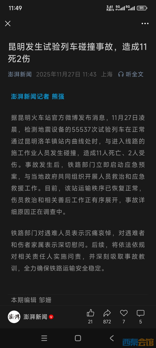 昆明呈贡洛羊镇列车撞死铁路施工人员。