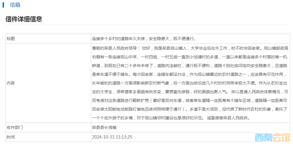 尊敬的荣县人民政府领导:您好,我是荣县观山镇人,大学毕业后在外工作,时不时会回老家。观山镇邮政局右侧有一条连接观山中学、一村四组、一村五组一直到小池塘村的乡道,一直以来都是连接多个村落的唯一机耕道,到现在已有二十多年未修了,道路坑洼破烂,通行极不便利,道路个别处临河临坎安全隐患大,且道路是单车道不便于错车。每次回老家,连错车都没办法,作为观山镇最近的农村道路之一,应该具有示范作用,长年破烂的道路一方面很影响新农村新气象,另一方面也给沿途几个村的村民带来极大不便。作为从农村走出去的大学生,很希望家乡面貌有所改变,要想富先修路,好的面貌也聚人气。所以恳请人民政府体察情况,可否考虑对这条道路进行翻新扩宽(最好是双向车道,或者单车道隔一定距离有个错车区域,道路隔一定距离可否安装太阳能电池板路灯省电且夜间照明便于通行)。乡道不是大项目,但代表了新时代农村的形象,寄托了一个个在外游子的乡情,对于观山镇邻村建设也是很好的示范。诚挚感谢荣县人民政府。