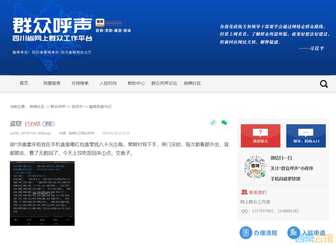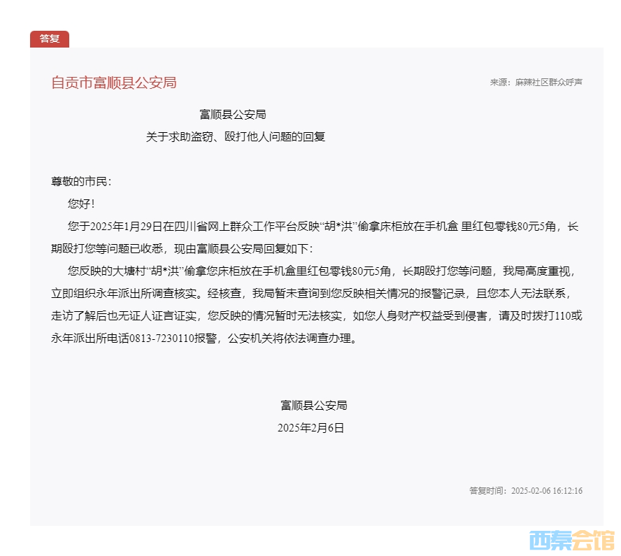 您于2025年1月29日在四川省网上群众工作平台反映“胡*洪”偷拿床柜放在手机盒 里红包零钱80元5角,长期殴打您等问题已收悉,现由富顺县公安局回复如下:
