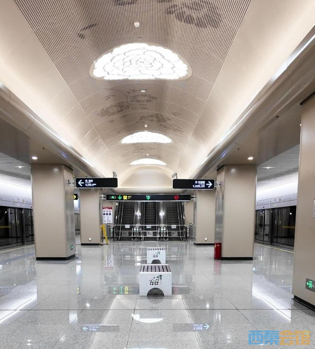 步入新南门站,连续的拱形结构唤起对古城门的记忆;天花板上芙蓉造型的花灯,宛若繁星点点;两侧墙面青蓝渐变如锦江波光,整体氛围简约现代而不失古典韵味。