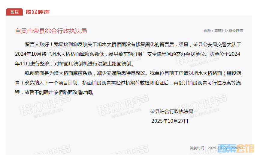留言人您好!我局接到您反映关于旭水大桥桥面没有修复黑化的留言后,经查,荣县公安局交警大队于2024年10月将“旭水大桥桥面摩擦系数低,易导致车辆打滑”安全隐患问题交办至我单位。我单位于2024年11月进行整改,对桥面用铣刨机进行混凝土路面铣刨。