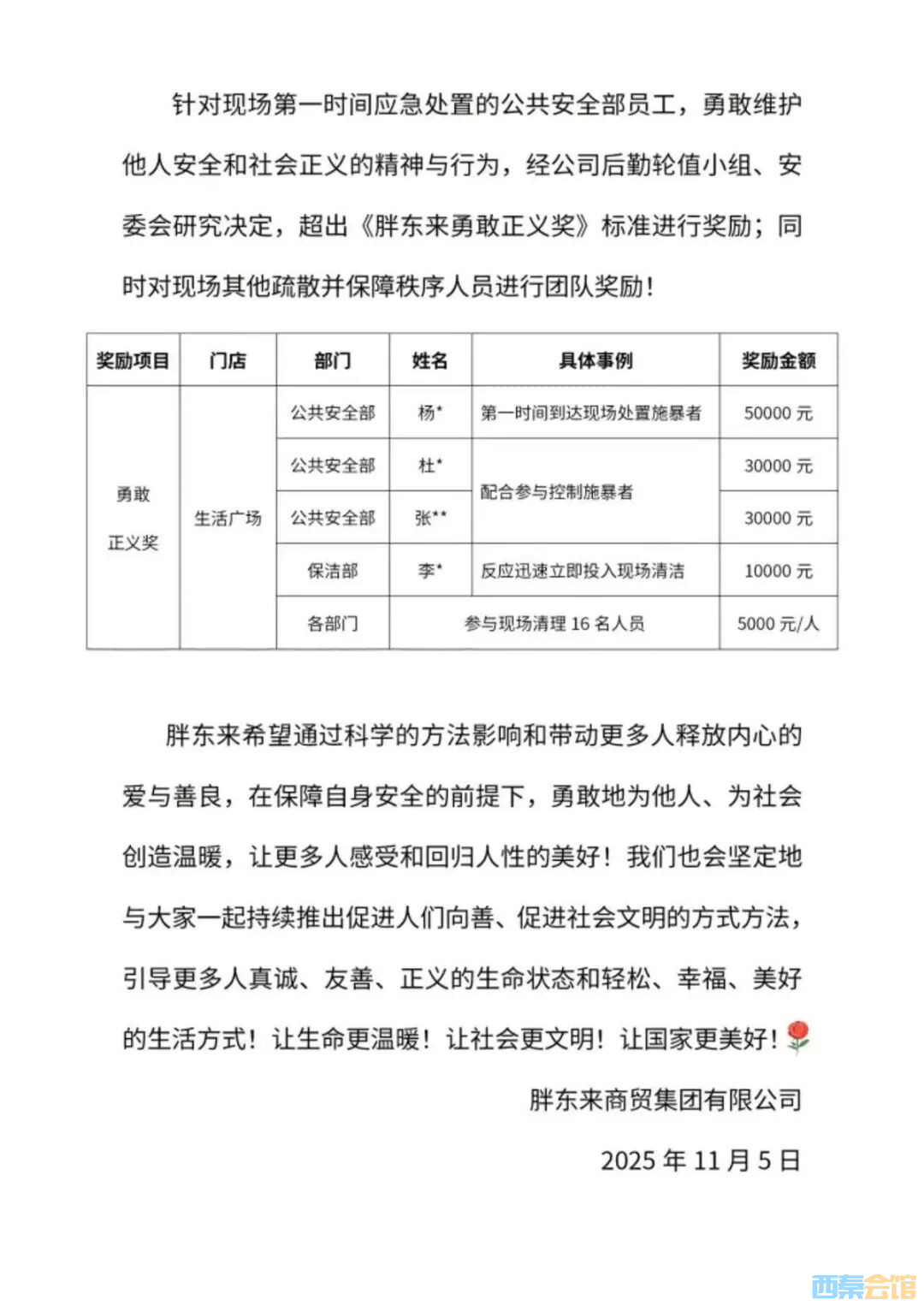 其中,给予第一时间到达现场处置施暴者的公共安全部员工杨某5万元奖励,配合参与控制施暴者的两人每人3万元奖励,反应迅速立即投入现场清洁的一人1万元奖励。此外,参与现场清理的16名人员每人奖励5000元。