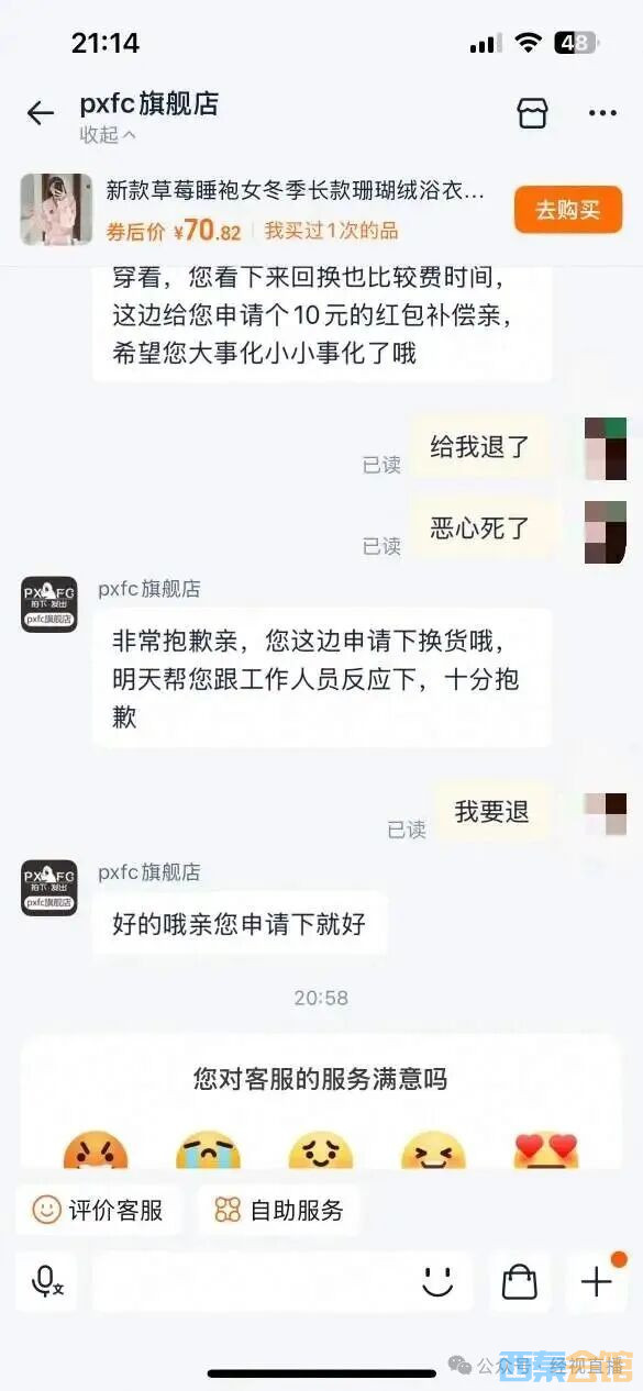 网购睡袍口袋中发现用过的妇炎洁,客服:不影响穿着,补偿10元..