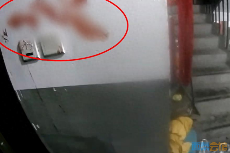 到三楼后,他看到墙面上也有类似血迹的血手印,且血迹延伸至一户老人家门口。