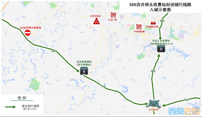 原计划从S66贡井桥头收费站入城车辆,建议经S66至永安枢纽后转入G85后,驶入自贡汇东收费站(G85银昆高速出入口)进入自贡市区。