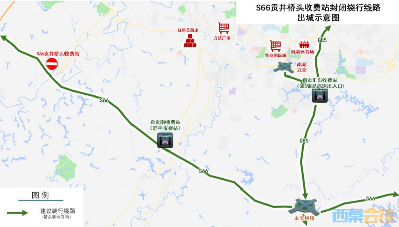 原计划从S66贡井桥头收费站出城车辆,建议经自贡汇东收费站(G85银昆高速出入口)驶离自贡市区。