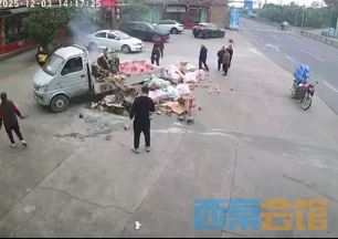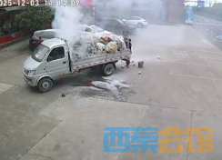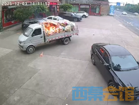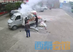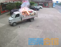 小货车的货烧起来了 开到了饭店门口 好大的烟