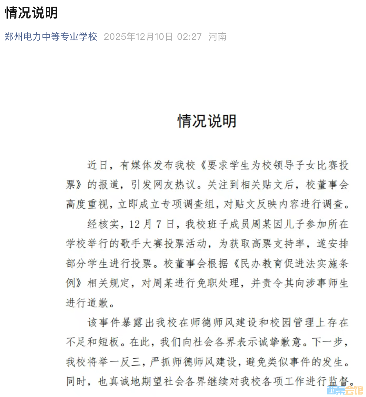 郑州一学校领导要求学生给自己子女投票?最新通报:免职!