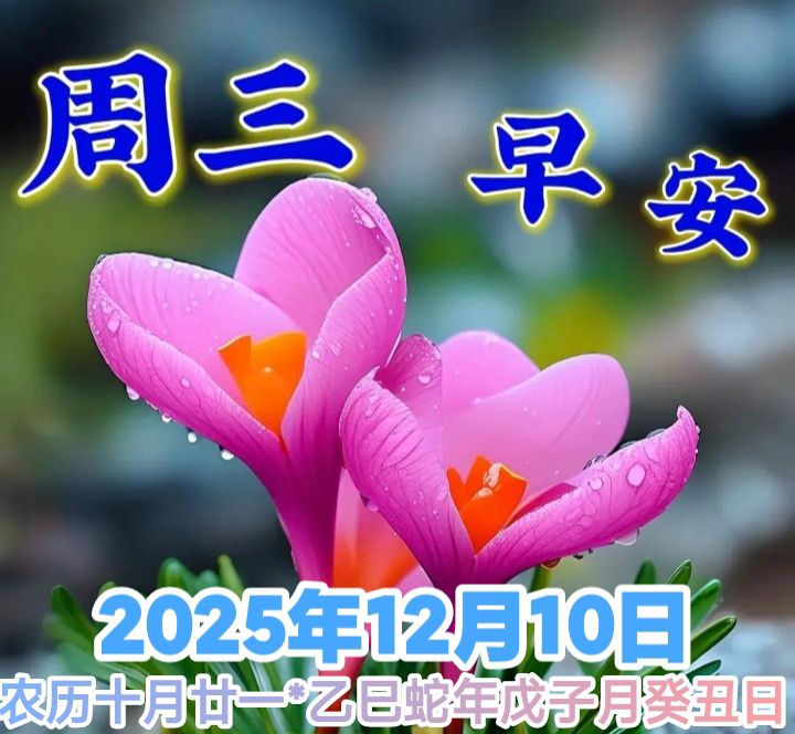 • #早安# 2025年12月10日 星期三 农历:十月廿一(乙巳年戊子月癸丑日) 今天十全十美吉祥日: 新的一天,万事如意, 平安天天好,万事顺意, 幸福吉祥,天天好心情,财源滚滚,开心快乐,祝 好运,早安吉祥,生活幸福一生一世,平安健康。 事业有成,学业有成,阖家幸福 愿您今日: 晨起有光,所遇皆暖。万事顺意如溪水长 流,平安喜乐似清风常伴。笑容是您最明亮的 点缀,好心情是您最珍贵的行囊。 愿您长久: 身心长安,诸事圆满。家睦业兴,福泽绵 延。前路步步生花,未来皆是璀璨。一生一 世,幸福安康,十全十美。 早安,吉祥如意。愿这份美好,从此刻延续, 直到永远。 #共同奔赴#