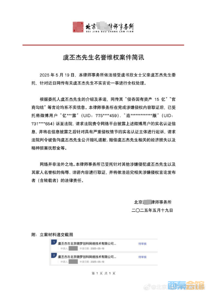 虞书欣父亲虞丕杰一纸文书,把网友给告了。