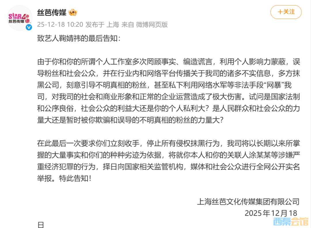 12月18日,上海丝芭文化传媒集团有限公司发文,具体如下——