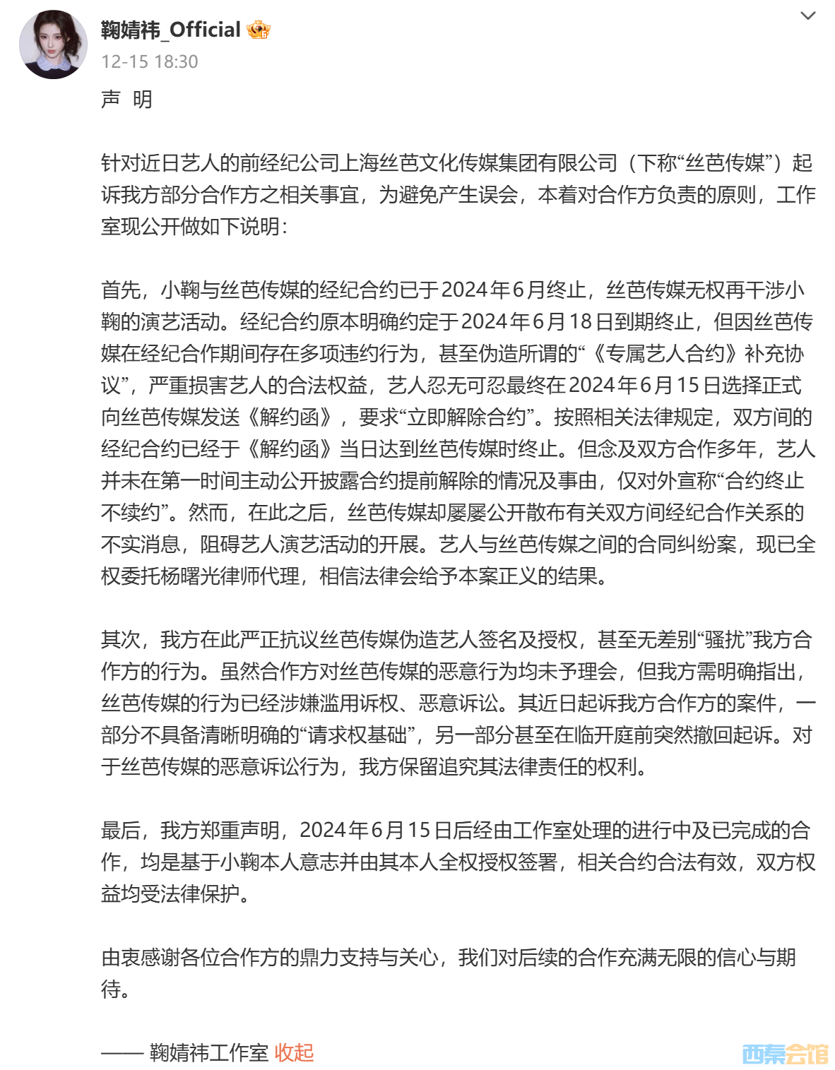 鞠婧祎方发布声明,称鞠婧祎与丝芭传媒的经纪合约已于2024年6月终止,合约原定2024年6月18日到期终止,但因丝芭传媒存在多项违约行为,甚至伪造补充协议,因此艺人在2024年6月15日要求解除合约。声明中还指控丝芭传媒伪造艺人签名及授权,甚至无差别“骚扰”合作方,称对于丝芭传媒的恶意诉讼行为将保留追究其法律责任的权利。