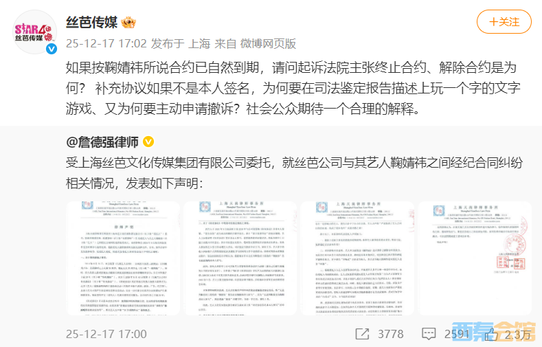 12月17日,丝芭传媒再次发文质疑鞠婧祎,称其解约行为自相矛盾,玩文字游戏。