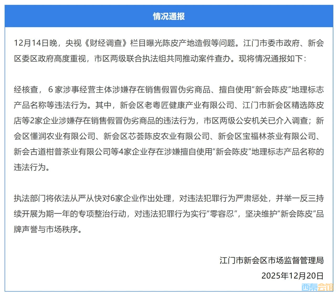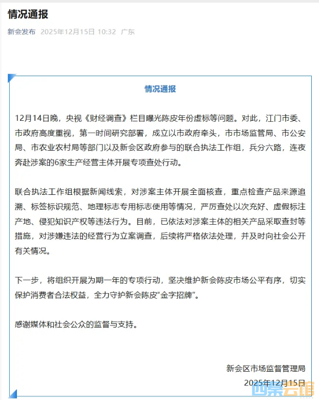 [color=rgba(0, 0, 0, 0.9)]12月14日晚,央视《财经调查》栏目曝光陈皮年份虚标等问题。对此,江门市委、市政府高度重视,第一时间研究部署,成立以市政府牵头,市市场监管局、市公安局、市农业农村局等部门以及新会区政府参与的联合执法工作组,兵分六路,连夜奔赴涉案的6家生产经营主体开展专项查处行动。