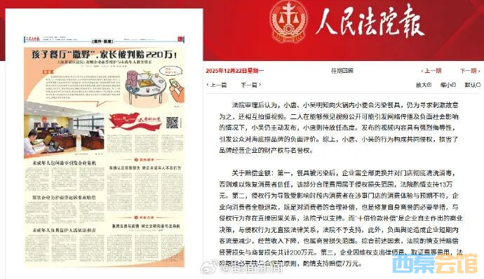 据此前报道,该案中,法院判令两名未成年人及其监护人向海底捞公司公开赔礼道歉,监护人赔偿海底捞公司经济损失220万元。