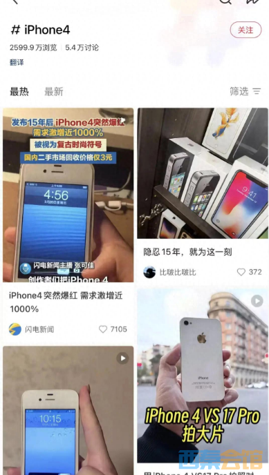 不少自媒体发布了分享帖(视频),称iPhone 4的拍照有独特的颗粒感、氛围感和朦胧感。当前,TikTok上相关发文已超过34万条。在小红书和微博等社交平台上,关于iPhone 4的分享内容也越来越多。其中,小红书上iPhone 4的话题已经超过5.4万条讨论,超2500万浏览量。在某二手交易平台上,甚至还有未拆封版本报价近千元。