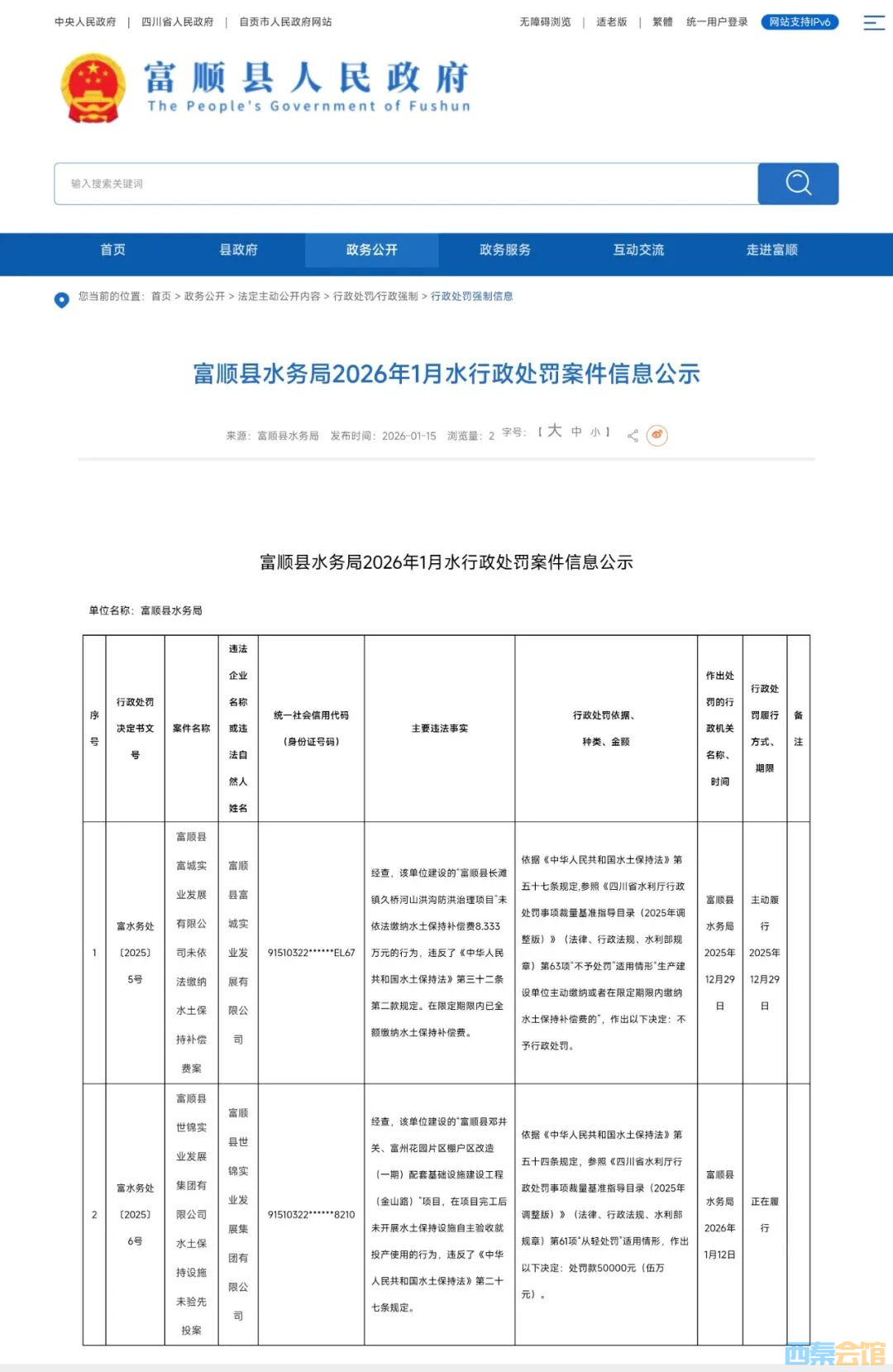 2 | 富水务处〔2025〕6号 | 富顺县世锦实业发展集团有限公司水土保持设施未验先投案 | 富顺县世锦实业发展集团有限公司 | 91510322******8210 | 经查,该单位建设的“富顺县邓井关、富州花园片区棚户区改造(一期)配套基础设施建设工程(金山路)”项目,在项目完工后未开展水土保持设施自主验收就投产使用的行为,违反了《中华人民共和国水土保持法》第二十七条规定。 | 依据《中华人民共和国水土保持法》第五十四条规定,参照《四川省水利厅行政处罚事项裁量基准指导目录(2025年调整版)》(法律、行政法规、水利部规章)第61项“从轻处罚”适用情形,作出以下决定:处罚款50000元(伍万元)。 | 富顺县 水务局2026年1月12日 | 正在履行 | |