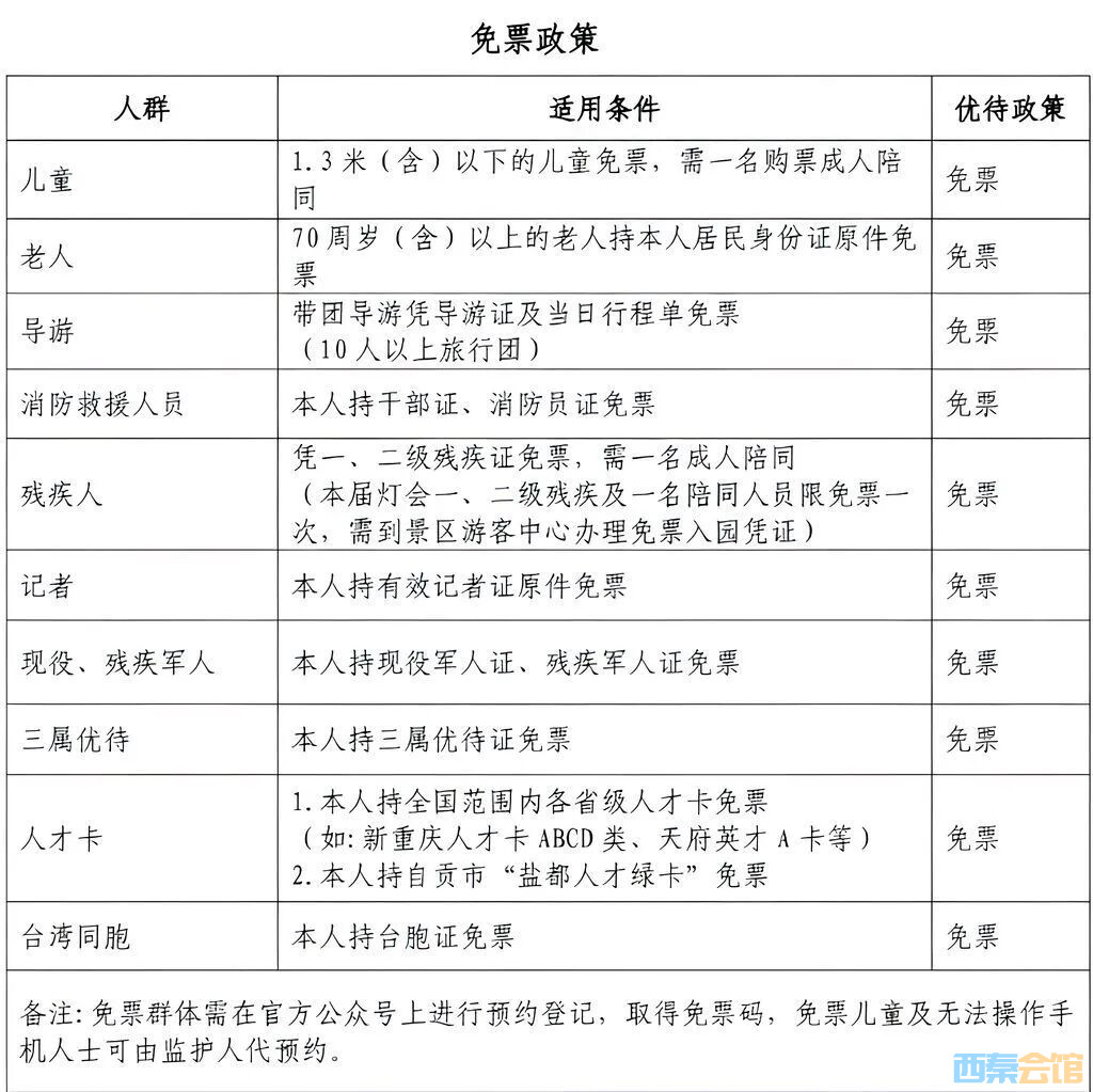 其中,免费入园人群为:1.3米(含)以下儿童(需一名购票成人陪同);70岁(含)以上老人(凭本人身份证原件);导游(当日带团导游凭导游证);消防救援人员(凭干部证、消防员证);残疾人(凭一、二级残疾证及一名陪同人员限免票一次,需到景区游客中心办理免票入园凭证);记者(凭本人有效记者证原件);现役、残疾军人(凭现役军人证、残疾军人证);烈士、因公牺牲军人、病故军人遗属(凭“三属”优待证);持人才卡人群(凭全国范围内各省级人才卡、自贡市“盐都人才绿卡”);台湾同胞(凭台湾台胞证)。
