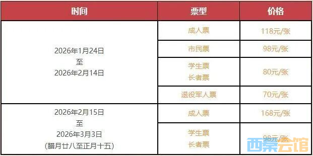 1月24日至2月14日、3月4日至灯会闭幕实施平谷期挂牌价,成人票118元/张,长者票、学生票80元/张。此外,平谷期还专门设有面向自贡、内江市民的98元市民票,以及70元的退役军人票,满足不同游客群体的多元需求。