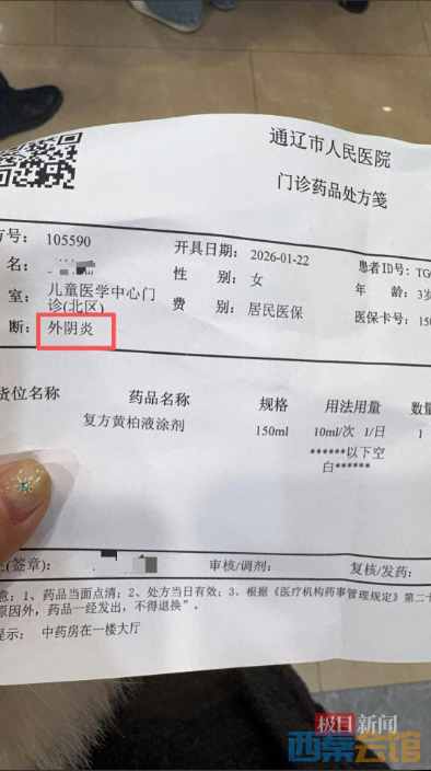 王女士提供的通辽市人民医院门诊药品处方笺显示,她3岁的小女儿医疗诊断为外阴炎,开具的药品名称为“复方黄柏液涂剂”,开具时间为2026年1月22日。