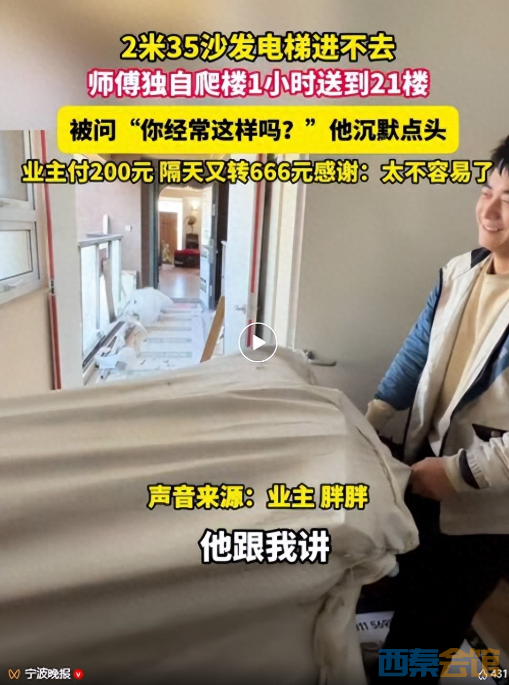 新买的沙发进不去电梯,运输师傅独自爬楼梯1小时到21楼送货,业主发666元红包表示...