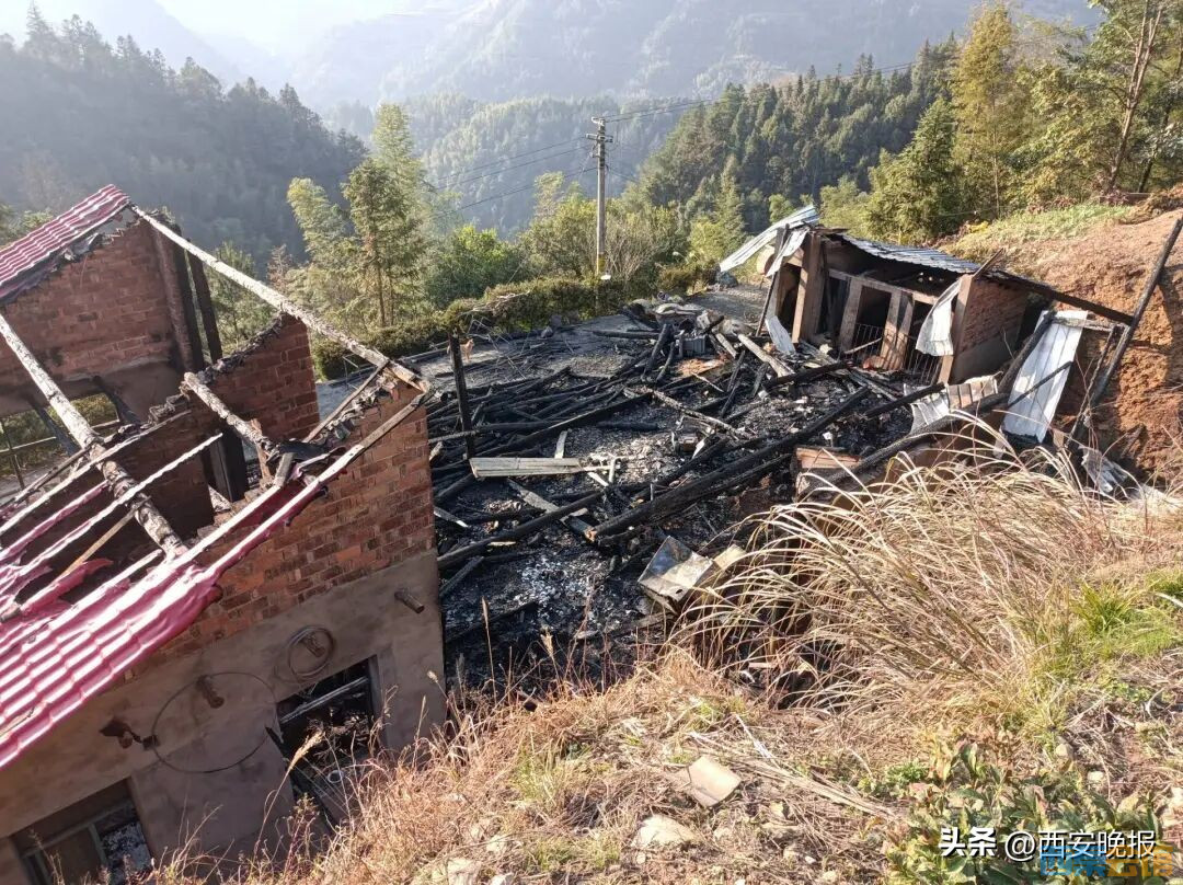起火房屋在盘山路边的山坡上,主房已完全烧毁,只剩下一堆烧焦的木梁,只有厨房和猪圈等因为是用红砖造的而没有倒塌。