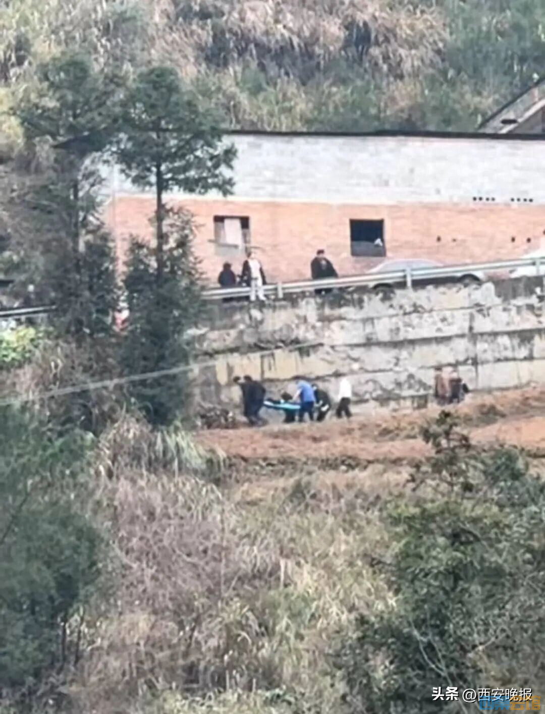 事发时附近村民拍摄的视频也显示,在山脚下,消防、120急救人员纷纷赶到,在坠崖地,众人将伤员从崖底抬上盘山路。