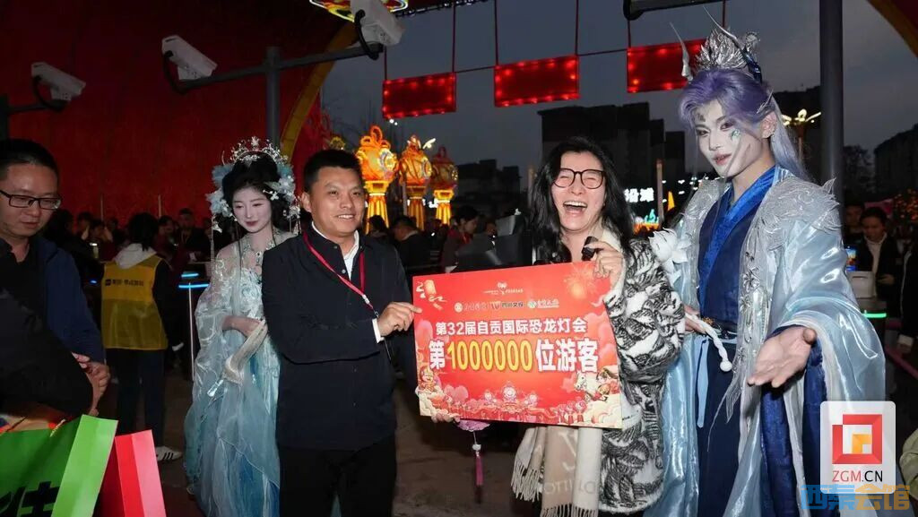 “恭喜您!您是本届灯会第100万名游客!”当天19时许,中华彩灯大世界入园通道前,来自成都的游客杨荑刚刚刷票通过闸机,便被等候在此的工作人员热情包围。鲜花、掌声、闪光灯——突如其来的惊喜让她愣了片刻,随即绽放出灿烂的笑容。灯会主办方工作人员为她送上带有“自贡”元素的城市冰箱贴、“时空龙骑士”公仔等特色文创纪念品,以及自贡灯会、盐业历史博物馆、恐龙博物馆、燊海井等景区门票,并邀请她共同合影,记录下这一难忘瞬间。