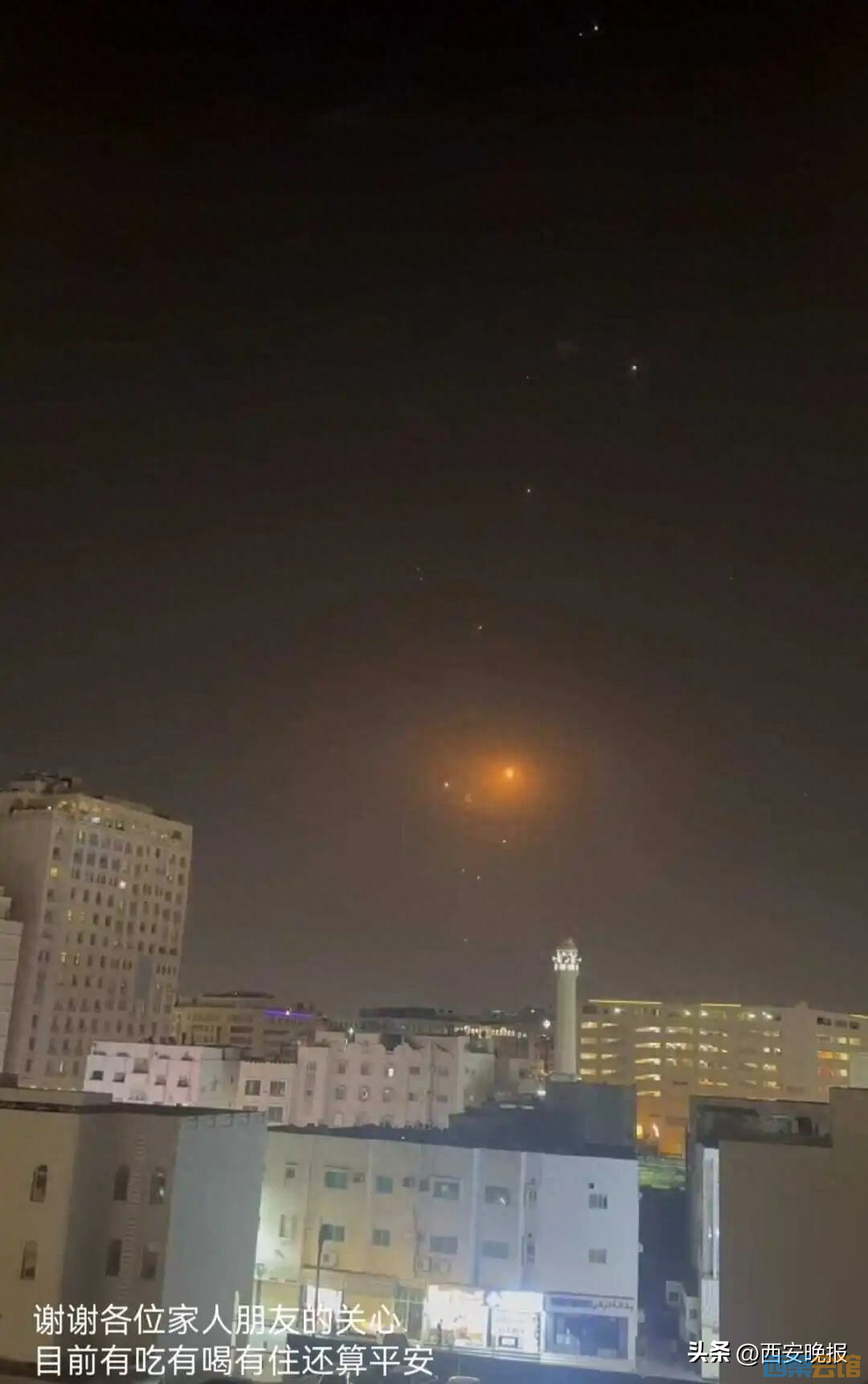 28日深夜11点半虞先生拍到的许多**空中爆炸视频截图(来源:虞先生微信朋友圈)