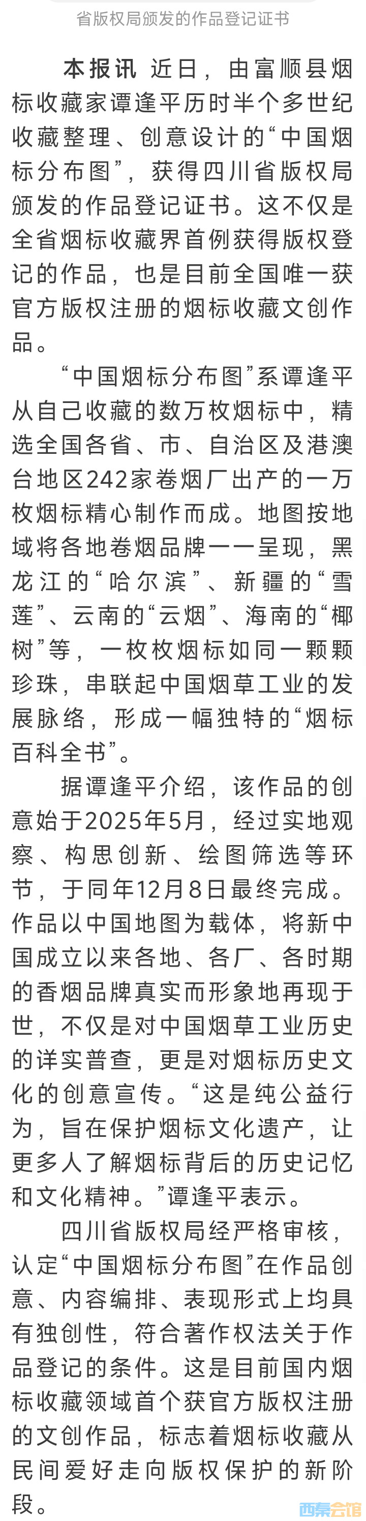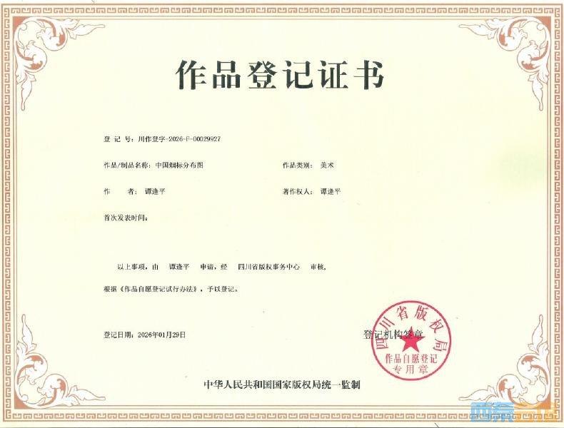 全国唯一!富顺谭逢平的“中国烟标分布图”获四川省版权局作品登记证书