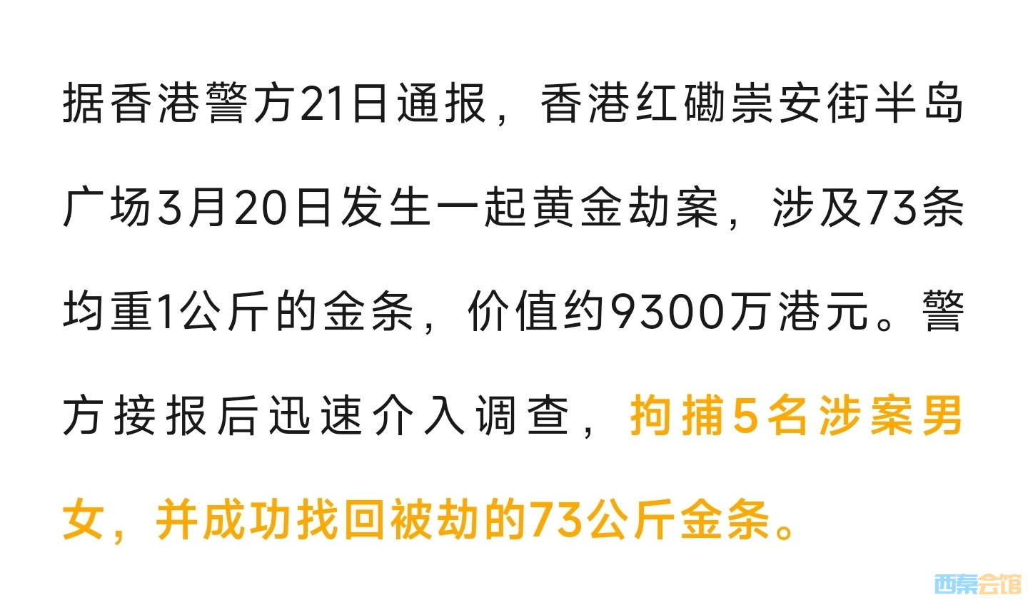 香港发生9300万黄金大劫案