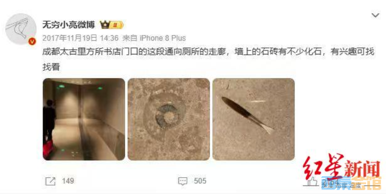 早在2017年,知名科普博主博物君@无穷小亮就提到过太古里负一楼的化石:“成都太古里方所书店门口这段通向厕所的走廊,墙上的石砖有不少化石,有兴趣可找找看。”当时@无穷小亮的配图是在太古里墙砖上拍到的菊石和箭石,天然的纹路看起来非常和谐、漂亮。